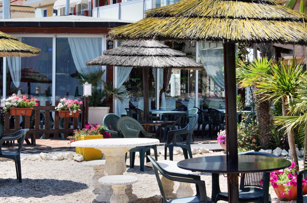 Il giardino sulla spiaggia e il ristorante, permettono di intrattenersi piacevolmente gustando piatti di pesce e pizze eccellenti.